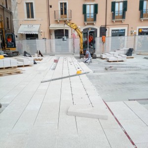 Si tratta di basoli derivanti da una roccia calcarea sedimentaria di natura clastico-organogena di colore generalmente bianco-avorio, posati sopra uno strato strutturale realizzato in calcestruzzo di cemento armato con una doppia rete elettrosaldata. Sopra tale strato verrà disposto uno strato di allettamento di malta premiscelata associato a un uso combinato di prodotti per la stuccatura, dello stesso colore per tutta l’estensione del cantiere, realizzando così un blocco monolitico intorno alla pietra durevole nel tempo.