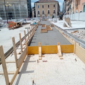 La scelta è stata determinata dalla volontà di riproporre la tipologia storica delle pavimentazioni del centro storico della città dell’Aquila.